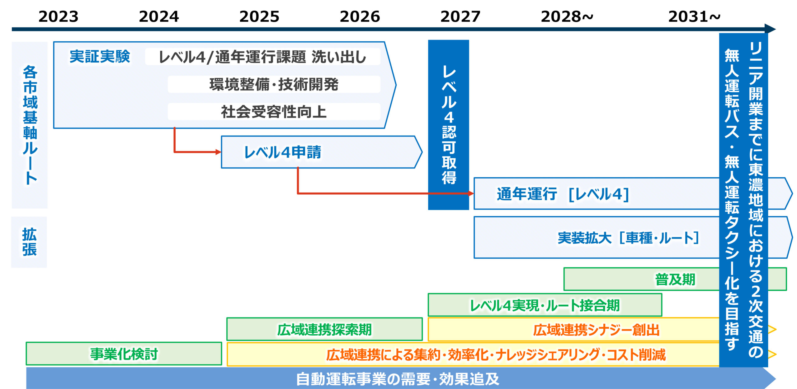 政府目標である「2027年度100か所以上で自動運転移動サービス実現」と連動し、岐阜県下での自動運転社会実装早期実現に向けて「東濃地域自動運転特区推進PT会議」や「東濃地域自動運転推進協議会」を立ち上げ公共交通におけるレベル4自動運転移動サービスの社会実装を最重要施策と位置づけ取り組んでいる。