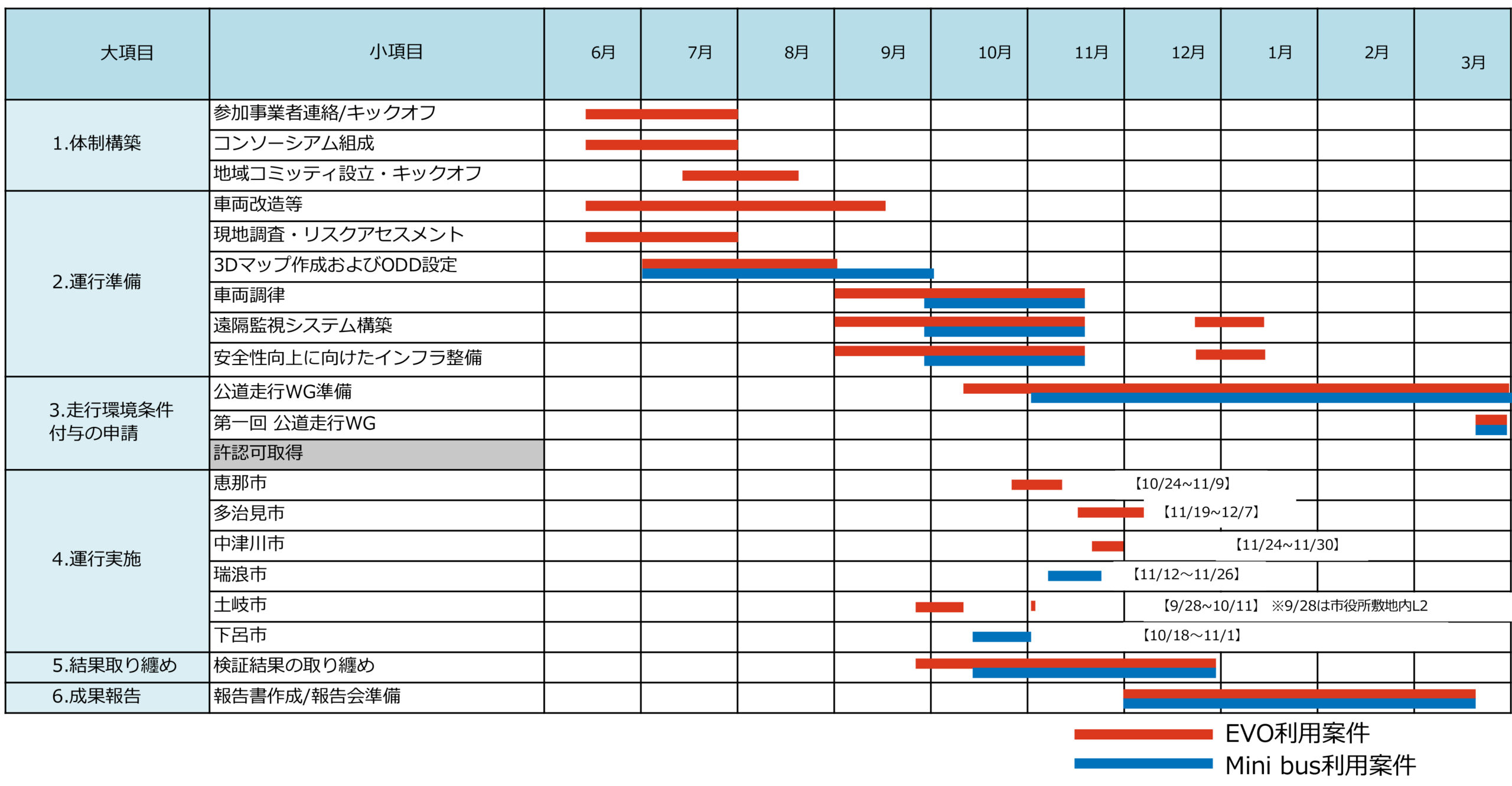 国土交通省「令和6年度地域公共交通確保維持改善事業費補助金 (自動運転社会実装推進事業)」の採択を得て、各市におけるレベル4自動運転の実装に向けた課題の検討及びリスクアセスメントの実施や自動運転の実装に至るロードマップの作成等を実施。