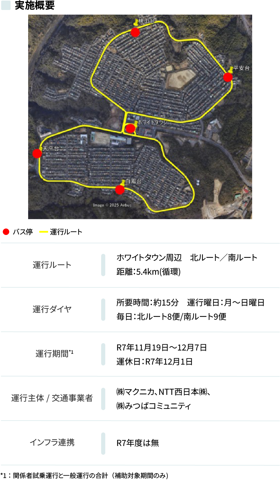 本事業を通して、郊外住宅地におけるラストワンマイル輸送を実現し、運賃収入の増加、外出機会の増加、幹線公共交通の利用率向上、地域事業者の収益増加に寄与します。本ルートは他公共交通機関の結節点となっており、乗り継ぎ可能な地点を経由地としている。これにより、他公共交通機関との連携を図ることが可能となり地域住民の利用促進が期待できる。