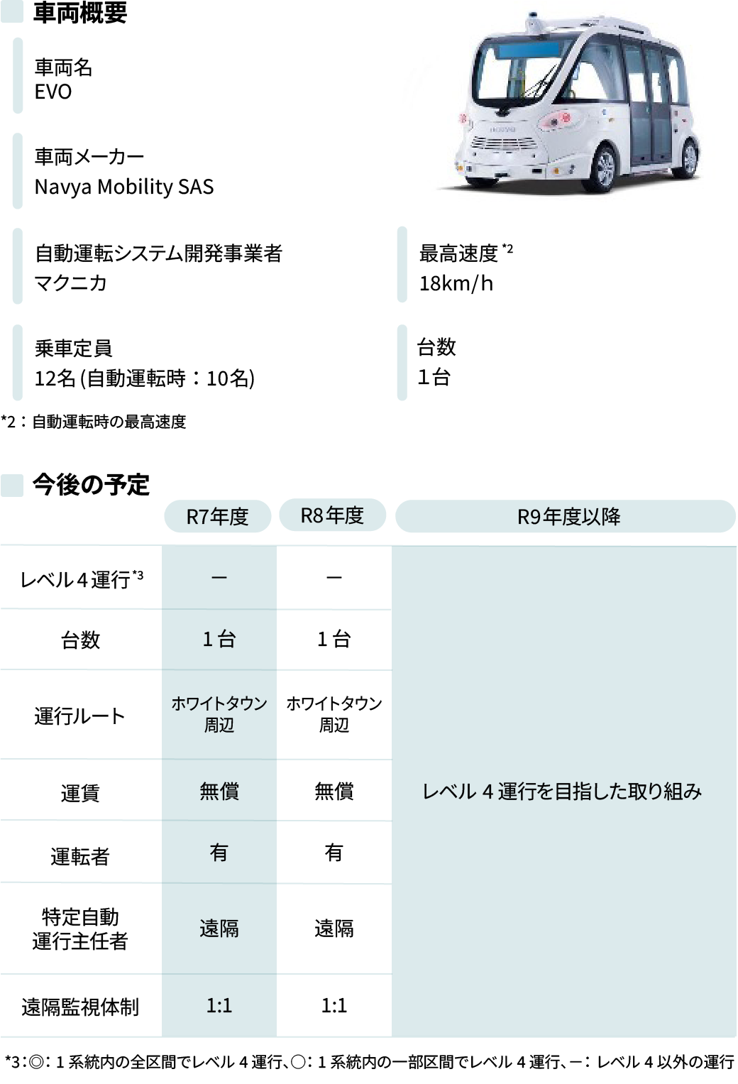 2027年にレベル4運行開始に向けて、今年度はレベル2での定時運行に取り組む。具体的には、実証実験を通じたリスク及び手動介地域の受容性、利便性、安全性に関する意見や利用データを収集する。